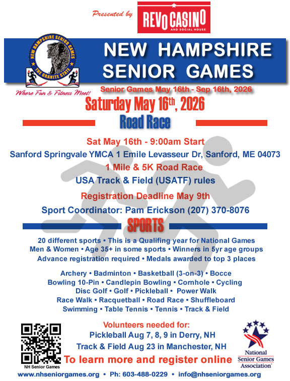Note: You will register with the NH Senior Games, then check-in and pick up your bib number at the Maine Senior Games registration table.